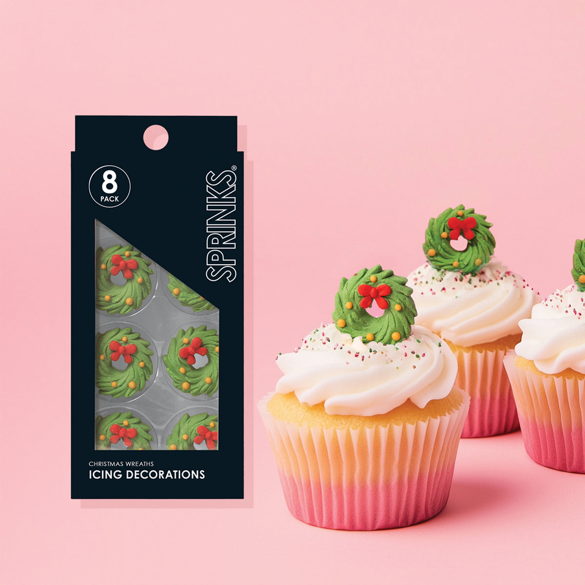 SPRINKS pack of 8 Christmas Wreaths decorations are edible ways to quickly elevate your baking on cupcakes, cookies and cakes.