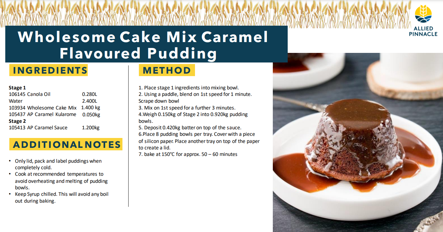 Add water, oil and cake mix into mixing bowl. Using a beater, blend on 1st speed for 1 minute. Scrape down bowl. Mix on 3rd speed for 5 minutes. Blend on 2nd speed for a further 5 minutes. Scale off batter 0.550kg into greased or paper lined baking tins.