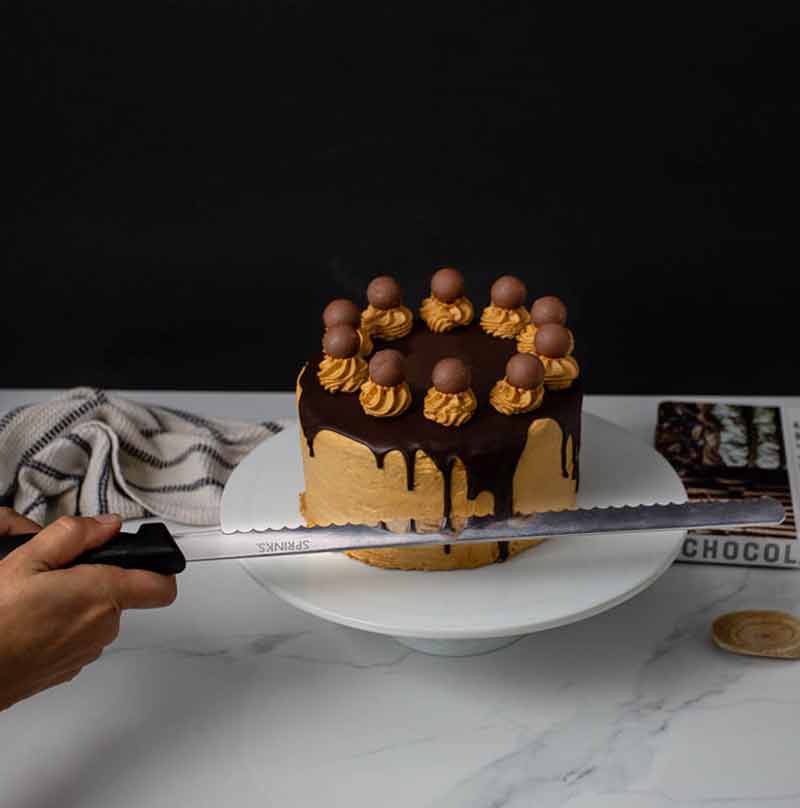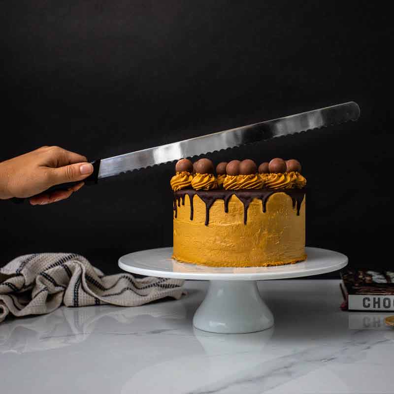 The Sprinks serrated cake knife has a comfort-grip handle and an extra-long 14" (35.5cm) serrated stainless steel blade which is well-suited for slicing through layers of cake when torting, or for slicing through multiple cake layers when serving.